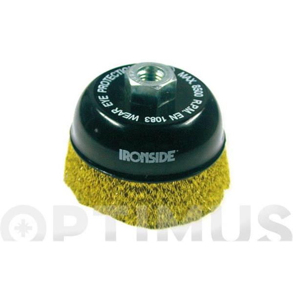 Cepillo tipo taza para amoladora M14 diámetro de 100 mm de púas onduladas y latonadas.
