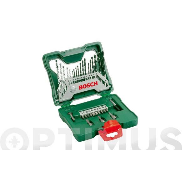 Perfectamente equipado para casi cualquier tarea: set versátil para el aficionado al bricolaje para perforar en madera, piedra y metal, incluye 13 puntas de atornillar, 3 llaves de vaso y soporte universal magnético. Características del producto: 18 brocas duraderas para trabajar en madera, piedra y metal. Madera: Ø 3–8 mm, piedra: Ø 4–8 mm y metal: Ø 2–5 mm. 10 puntas de atornillar para los tornillos más habituales con cabeza Phillips, Pozidriv, Torx y de ranura longitudinal. 3 llaves de vaso para tornillos hexagonales. Práctico maletín X-Line Bosch que proporciona orden y una buena disposición, en caso de necesidad es posible reequiparlo. Apropiado para todas las marcas de herramientas eléctricas. Nota: Al perforar metal se recomienda la utilización de líquido de refrigeración, por ejemplo, aceite para corte universal. Aviso de seguridad: Utilizar la protección correspondiente y necesaria en función de la aplicación.