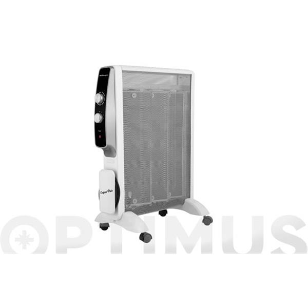 RADIADOR DE MICA. 2 potencias de calor: 500- 1500W. Elemento calefactor MICA. Rápida convección y difusión del calor. Máximo rendimiento en 1 minuto. No consumo oxigeno. Dispositivo de seguridad "antivuelco" Termostato regulable de temperatura. Protección contra sobre-calentamiento. Sin fluido. Ruedas incluidas. Voltaje 230V.