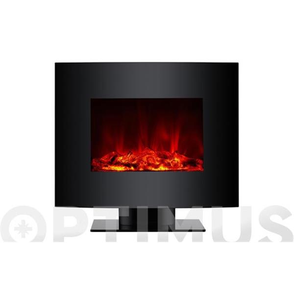 CHIMENEA ELECTRICA CON PIE Y FRONTAL CURVO.Medidas (LxPxH): 66x15.5x52 cm Potencia máxima: 2000W Termostato de temperatura seleccionable de 15º a 30ºC. Programación semanal de funcionamiento. Función detección de ventana abierta. Calor por convección. Panel frontal curvo de cristal templado color negro. Protección contra sobrecalentamiento. Efecto llamas reales por led, ajustables. Mando a distancia. Instalación con pie o mural.