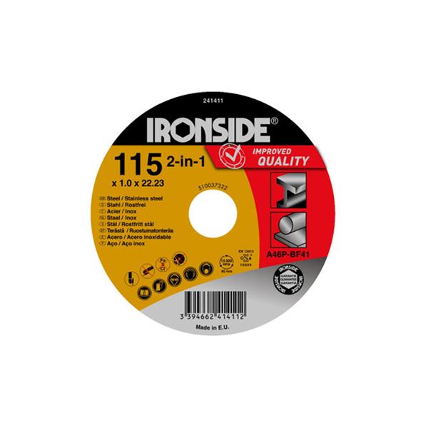 DISCO ABRASIVO CORTE 2 EN 1 PARA METAL Y ACERO INOXIDABLE 115 X 2,5 X 22 MM IRONSIDE