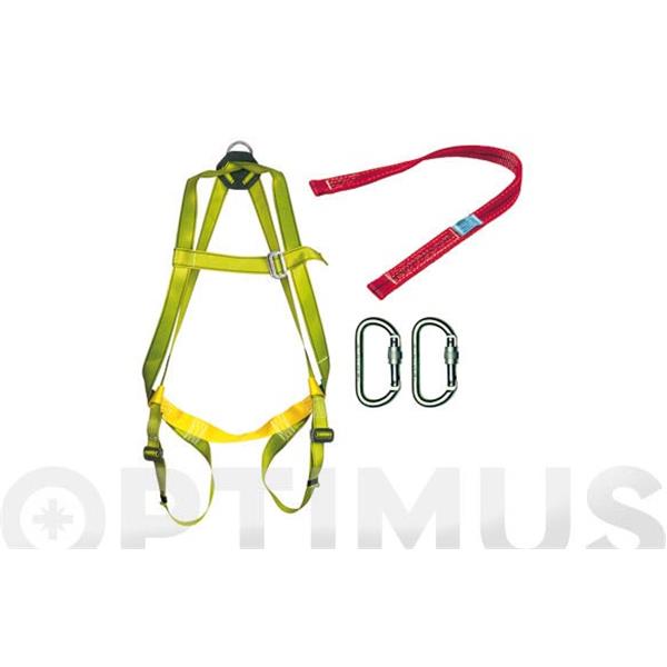 Arnés con 1 punto de anclaje dorsal, elemento fijo de amarre de 80 cmy 2 mosquetones de seguridad.