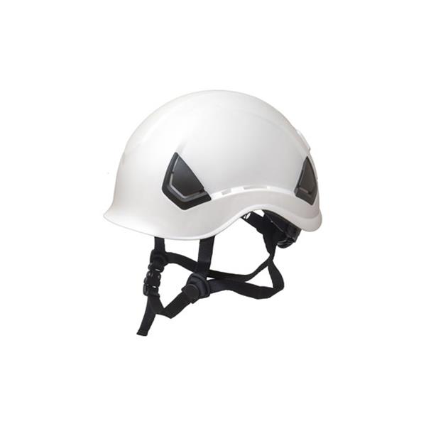 El casco de protección está fabricado en ABS. Sin visera visera para facilitar la visibilidad en todos los ángulos. Dispone de ranuras laterales universales para adaptar las gafas abatibles y de una ventilación regulable en la parte posterior. El arnés es textil y tiene 6 puntos de anclaje. Su regulación es de tipo rueda. El barboquejo tiene 4 puntos de anclaje para una mayor sujerción y adaptabilidad del mismo al operario. Cumple la norma CE EN394.