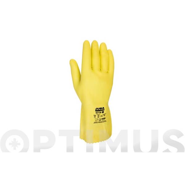 Guante sin soporte de látex natural color amarillo. Para uso doméstico, cocinas, limpieza. Alimentación. Agricultura. Laboratorios. Mantenimiento ligero. Ergonómico y flocado para mayor confort. Forrado de algodón para absorber el sudor. Buen agarre debido al acabado en panel deabeja. Excelente relación calidad-precio. Apto apra uso alimentario. Apto para uso alimentario según Directiva 10/2011.