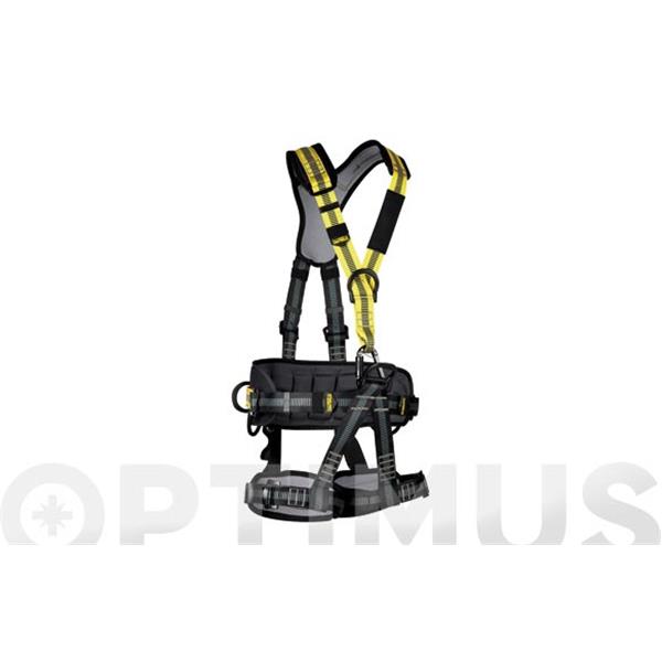 Arnés anticaídas con arnés de asiento y con cinturón de posicionamiento. Enganche ventral, dorsal, frontal y cinturón de posicionamiento regulable con anillas de sujeción laterales según EN358. Arnés de gran ergonomía, ligereza y versatilidad. Anilla dorsal y esternal en aluminio y acordes con la EN361. Anilla ventral en aluminio acorde con la EN813. Anillas laterales en cinturón en aluminio acordes con la EN358. Espalda y perneras acolchadas. Cinturón de posicionamiento regulable con anillas para trabajos de posicionamiento en postes, torres, etc. Doble regulación arnés y regulación en perneras para mejor adaptación. Usos y empleo: en actividades que requieran trabajar en suspensión, con riesgo de caída en altura y necesidad de posicionarse para trabajar en actividades relacionadas con la construcción, mantenimiento de fachadas, torres, postes y andamios, industria, refinerías, plantas generadoras, montajes, rescate y emergencias…