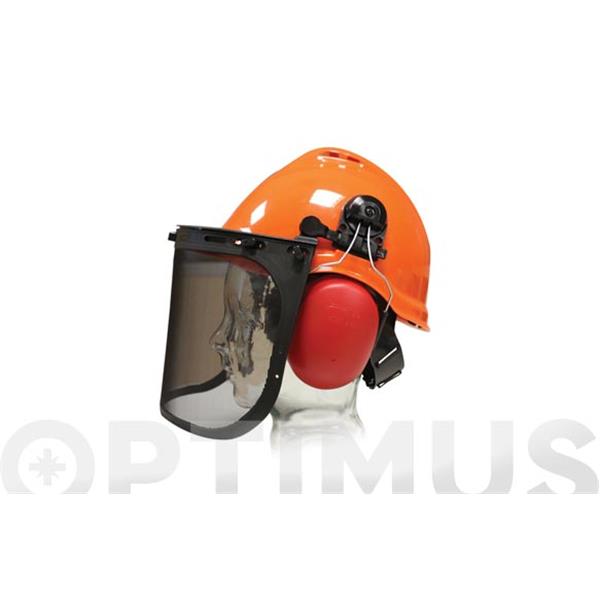KIT FORESTAL. Conjunto de protección craneal, facial y auditiva destinado a tareas forestales. Compuesto por: Casco de construcción modelo JUMBO con RUEDA con arnés textil y 4 puntos de amarre (EN 397) color naranja. Soporte de pantalla universal (EN 166). Pantalla metálica 200 x390 mm (EN 1731). Visor abatible 90º. Protector auditivo SNR 25,9 dB(EN 352-3) color rojo.