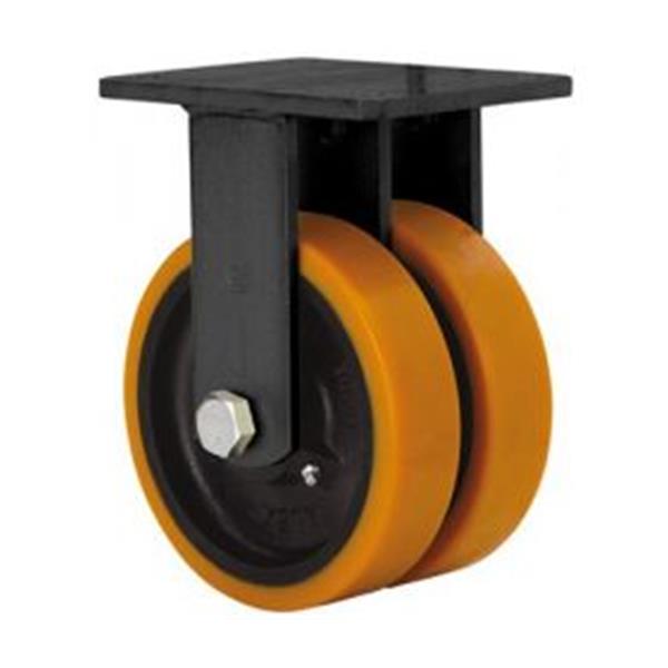 Fabricada con chapa de acero soldado hasta 8 mm de espesor. Acabado pintado negro. Combinación de cojinetes de bolas y cónicos en el soporte: el superior para esfuerzos axiales y el inferior para esfuerzos radiales. Cabezal giratorio hermético, con engrasadores en el cabezal dels soporte y en la rueda.