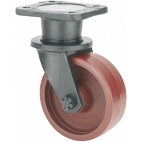 Fabricada con acero forjado hasta 30 m/m de espesor. Acabado pintado negro. Cabezal giratorio y eje de la rueda con dos rodamientos Timken en posición opuesta que permiten soportar trabajos de remolque (esfuerzos laterales). Engrasadores en el cabezal del soporte y en la rueda.