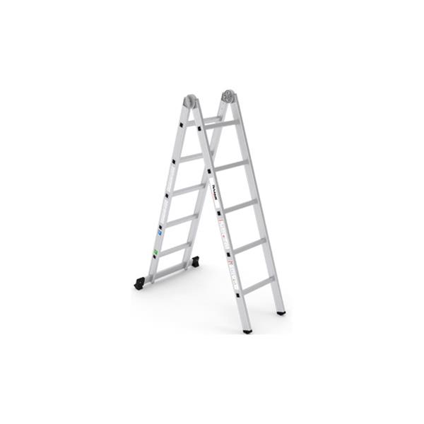 5 + 5 peldaños. Escalera de aluminio con dos posiciones de trabajo, extendida y tijera. 3,5m extendida y 1,51 a tijera. Fabricada según norma UNE 131