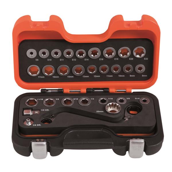 Juego de 29 piezas de llave plana con carraca en S + Juego de adaptadores.