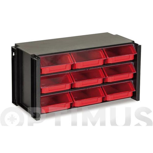 CLASIFICADOR APILABLE DE PLÁSTICO NEGRO Y ROJO 9 GAVETAS 170 X 360 X 190 MM TAYG