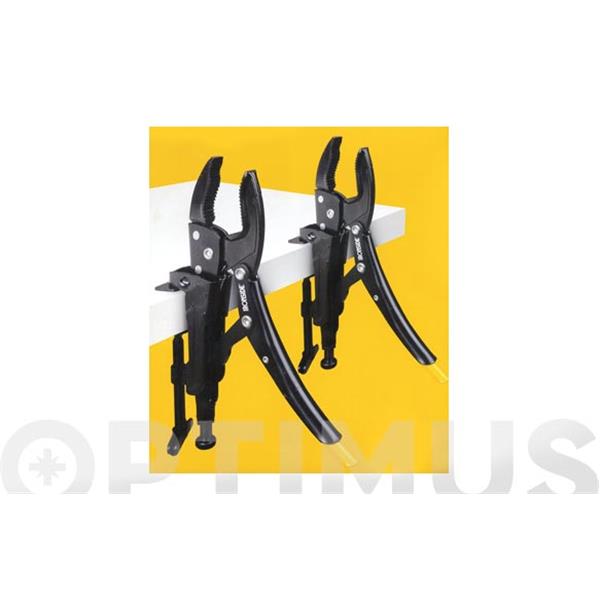 Bocas que combinan configuraciones rectas, curvas y convexas: Aportan versatilidad para agarrar formas distintas, redondas, planas, cuadradas. Un concepto innovador. Consiste en 2 Grip Omnium 254 mm. y 2 Soporte Grip que, utilizados conjuntamente, forman un sistema de tornillo de banco portátil. Multi-uso ideal para todos los gremios, soldadura, mecánica general, bricolaje etc. Ideal para cortar, encolar, soldar, roscar... IRONSIDE