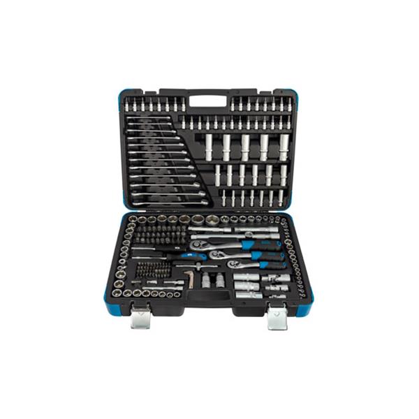 Herramientas de 1/2" 14 vasos: 13, 14, 15, 16, 17, 18, 19, 20, 21, 22, 24, 27,30, y 32mm 5 vasos largos :16, 17, 18, 19 y 22mm 3 vasos torx: E20, E22, y E241 carraca 72 dientes 2 barras extensión de 125mm y 250mm 1 articulación universal 1 adaptador H 3/8" M 1/2" 2 vasos de bujía de 16mm y 21mm 1 adaptadorde cabezales (8mm) 2 cabezales para Torx T70 y Allen 14mm 7 llaves allen: 1.27, 1.5, 2, 2.5, 3, 4 y 5mm 12 llaves comb.: 8, 9, 10, 11, 12, 13, 14, 15, 16, 17, 18 y 19mm Herramientas de 1/4" 13 vasos de: 4, 4.5, 5, 5.5, 6, 7, 8, 9, 10, 11, 12, 13 y 14mm 7 vasos de: 4,5, 6, 7, 8, 9 y 10mm 5 vasos torx: E4, E5,E6, E7 y E8 1 carraca 72 dientes 1 articulación universal 1 mango destornillador 2 barras extensión de 50mm y 100mm 1 mango corredizo 1 adaptador de cabezales (6mm) 30 cabezales para el mango destornillador Estrella: #0, #1, #2 // Estrella doble: #0, #1 y #2 Allen: 3, 4, 5 y 6mm // Plano: 4, 5.5, 6.5 y 7mm Torx: T8, T9, T10, T15, T20, T25, T27 y T30 Torx Inviolable: T8,