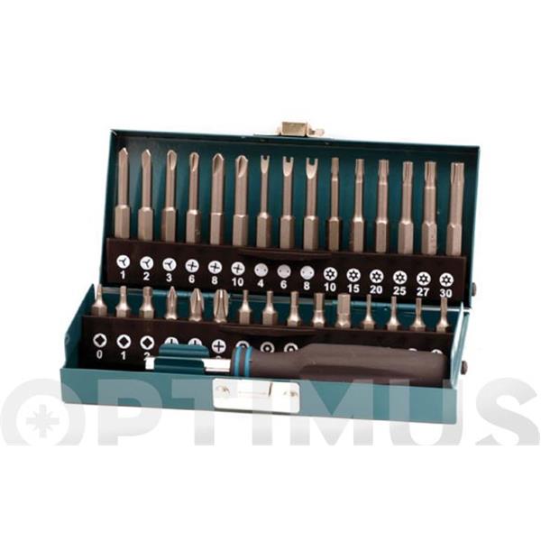 1 caja de puntas de seguridad combinadas 31 piezas. Para reparación demuchos electrodomésticos corrientes, ordenadores, etc. En estuche métalico. 3 Hembra cuadrada interior, 25 mm, 0 - 1 - 2. 3 Phillips, 25 mm, 1 - 2 - 3. 5 hexagono Interior, 25 mm, 2 - 2,5 - 3 - 4 - 5. 4 Torxcon orificio, 25 mm, 6 - 7 - 8 - 9. 3 Tri-Wing, 50 mm, 1 - 2 - 3. 3 Torq, 50 mm, 6 - 8 - 10. 3 Spanner, 50 mm, 4 - 6 - 8. 6 Torx con orificio, 50 mm, 10 - 15 - 20 - 25 - 27 - 30. 1 atornilladores manuales, mango de 2 componentes.