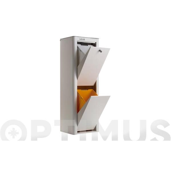 Cubo de basura y reciclaje CUBEK color blanco texturado con dos cubos de plástico de diferentes colores para facilitar la clasificación de los residuos y dos compartimentos accesibles desde la tapa superior color gris: uno para el reciclaje de las pilas usadas y otro para las bolsas de basura. Cantos redondeados para una mayor ergonomía del mueble mejorando notablemente su estética. Tapa superior silenciosa. Con el CUBEK, ya no hace falta ir a buscar el rollo de bolsas. Por fin lo puedes tener todo a mano en un mismo mueble. Dispone de 2 cubos interiores de plástico de diferentes colores, para facilitar las tareas de clasificación. Cada compartimento tiene más de 20 litros de capacidad. Fabricado en chapa de acero y lacado con pinturas anti-bacterianas, evitando condensaciones y minimizando los malos olores que éstas conllevan. Posibilidad de colgarlo de la pared. Se suministra con un juego de tornillos. Capacidad, higiene y diseño en tu cocina. MEDIDAS: H 98,5 x A33,6 x F29,5 cm.