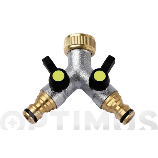 fabricada en latón, ideal para uso exterior. Forma de "Y" con terminación en enchufe rápido. Permite la conexión de dos mangueras de riego,con llave de paso para uso independiente.