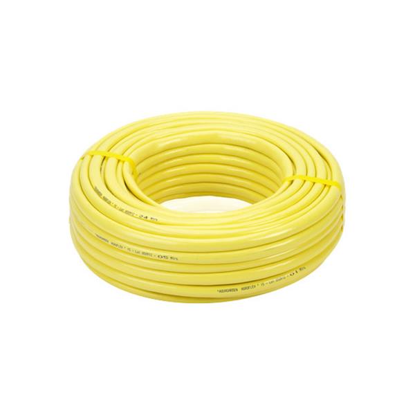 Manguera de PVC plastificada de triple capa, reforzada con hilos de poliéster y tratamiento anti-solar, de gran resistencia a los agentes atmosféricos y al envejecimiento. Color: Exterior amarillo, interior negro. Ideal para riego por aspersión, jardinería, construcción y conducción de líquidos a presión. Temperatura trabajo: -15°C a 60°C. Se presenta en bobinas de 50 / 25 m.