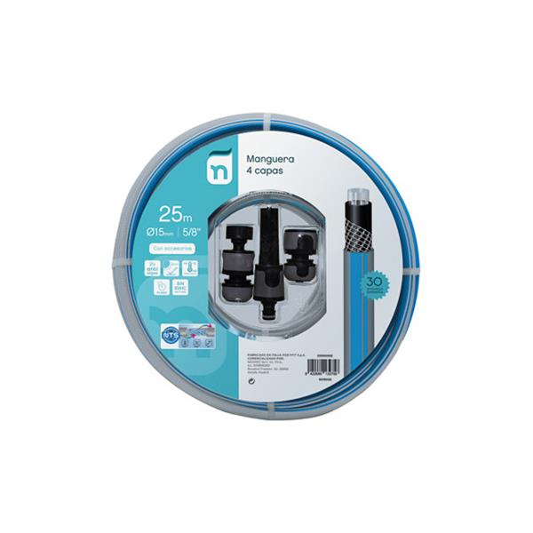 MANGUERA TRICOTADA AQUA PLUS. Diámetro 15 mm. Manguera de PVC plastificada de 4 capas con refuerzo textil tricotado en poliester textil, Antitorsión, que le concede mayor resistencia y tenacidad. Presión 20 bar. GARANTÍA 10 AÑOS. Largo 25 mt