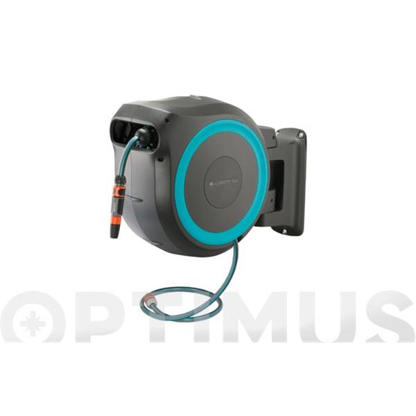 Portamanguera automático RollUp M/L 25 mt Linea Azul Turquesa Nueva estructura interior que permite reducer el tamaño de la caja – menos molesto misma expriencia Incl. lanza pulverizadora, water stop, 2 conectores, conectores de grifo de 3 tamaños (1/2”, 3/4”, 1”), tornillos estándar , enganches de pared y ayuda de montaje – listo para usar sin olvidar nada. Medidas soporte pared 45 x 17 cm