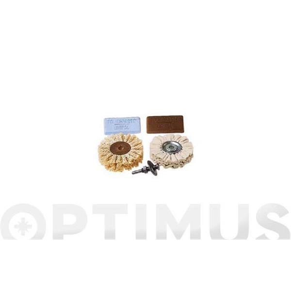 1 juego profesional de pulir. Contenido: 1 disco pulidor, ø 85 mm. 1 cepillo de cuerda sisal, ø 85 mm. 2 pastas de pulir. 1 vástago.