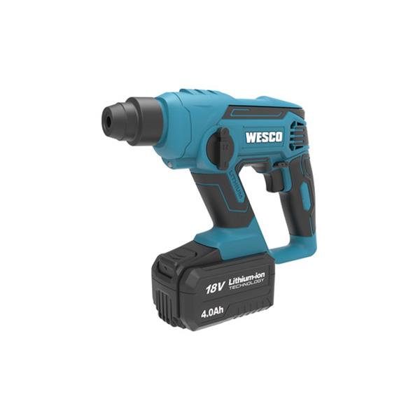 Agarre de goma sobremoldeado. Velocidad variable con marcha atrás. Rotación hacia adelante y hacia atrás. Función (martillo, taladro y destornillador). Sistema de cambio rápido SDS-plus. Luz LED. 18V. SDS Plus 1,3 Julios 1 batería de 4,0 Ah. 1 cargador 2A.