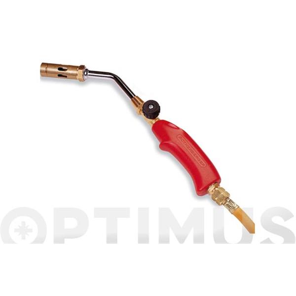 Soplete compuesto por mango con regulador, 2 metros de manguera de alta presión, quemador de 22 mm Ø y lanza de 100 mm. Conexión de salida W 21,8. Incluye grifo para botella azul..