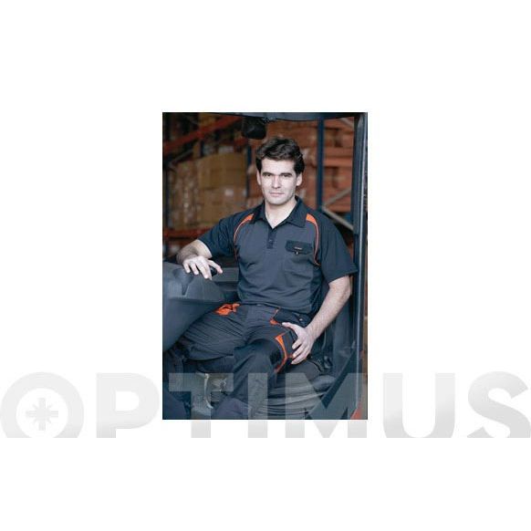 Polo bicolor (negro y gris) de manga corta con detalles en naranja y bolsillo con cierre de fijación textil.
